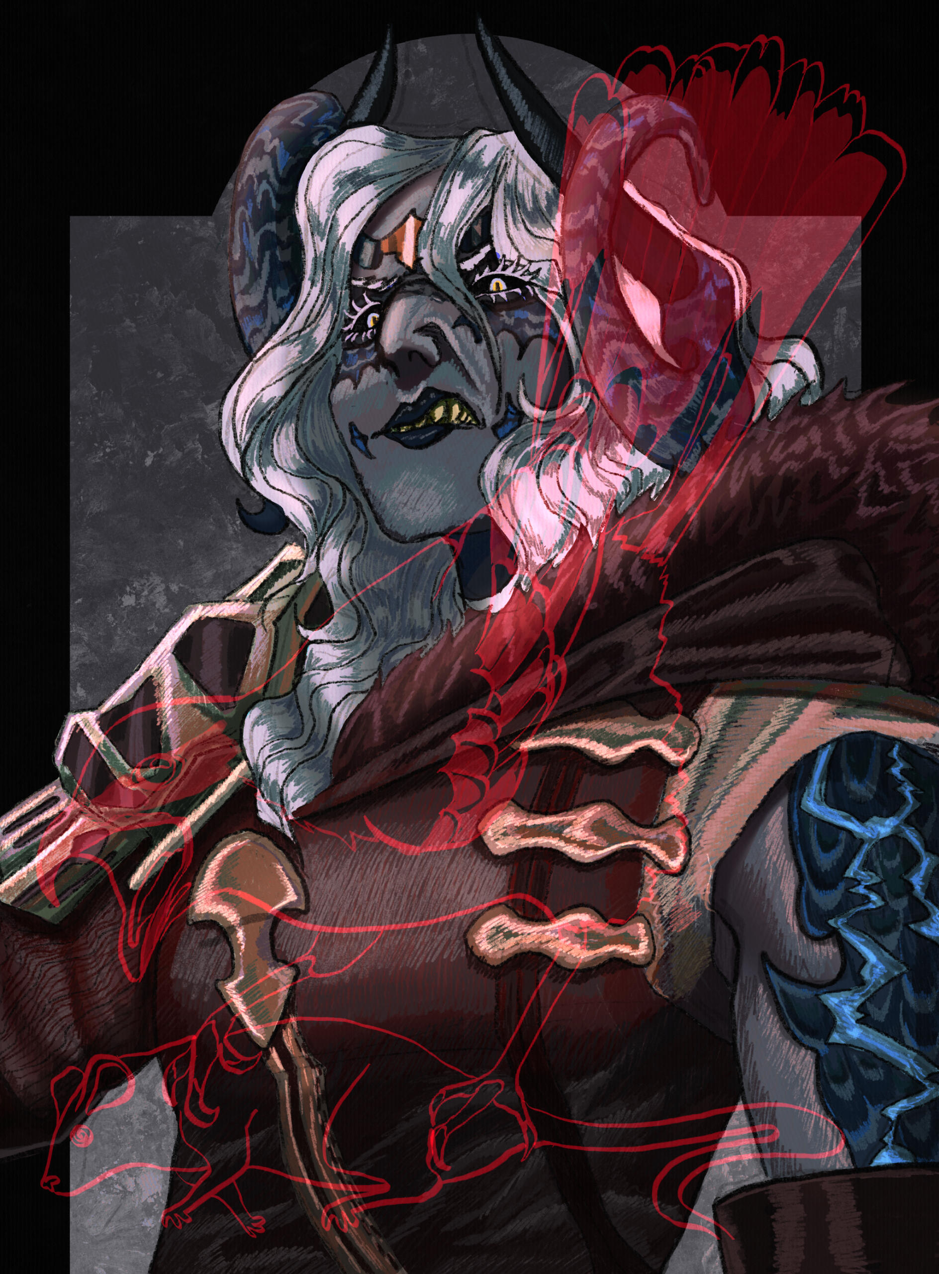 Born to a Qalli father and a Qerel mother on the Azim Steppe, Altaani was born into a life of adversity through no circumstance of her own. Raised under her mother's scrutinizing eye and held to sky-high standards of Qerel excellence, Altaani's solace was found beyond her grueling training - in particular, she took much enjoyment in bouts of Azim Bokh with her tribemates, and late-night indulgence in carafes of kumis around the campfire recounting Xaelic folkloric legends for those who cared to listen.As the years went on and she completely failed to manifest an Inner Beast in any shape or form - an expectation for any Qerel, notably for the daughter of an esteemed berserker - tensions between Altaani and her mother, Ankhbayar, began to mount, and she began to savor the first tastes of defiance of her established fate. With that defiance, however, came an innate shunning from her tribemates, orchestrated by her mother's wounded pride; lest she lose everything she had worked for, Altaani surrendered her defiance to bear her axe for the Qerel in her first Naadam.As if life had fated it to further alienate her from her peers, the silent shadows that had coalesced around an embittered Altaani manifested on the bloodied battlefield of the Naadam into the form of her twin Darksides, Sonata and Scorn, for the eyes of all to see and to further decry the outlandish circumstances of her existence. Two halves of a newly-shattered soul, one love and one loathing, took up blade against the other in a brutal, bloody battle for dominance over Altaani's soul that left the bodies of friend and foe alike strewn across the steppes - and cost the Qerel their much-desired victory in the wake of the pandemonium.With her tribe's blood on her hands and the loathing of the Qerel and her mother alike chasing her from the tribe, Altaani sought refuge in the only other home she'd ever known - amongst the ranks of the Qalli. Even here, however, her newfound scrutiny as the Black Ram of the Steppe and a curse hewn by Nhaama's hand meant she could not find solace; tormented by her twin Darksides and the abyssal magicks that had all but consumed her, Altaani found herself surrounded by bitterness for the world and every life left upon it.Even the continued love of her peaceful Qalli father for his daughter could not tame the abyss Altaani had tumbled into in a freefall; she left the Steppe as soon as she was capable of doing so in search of answers. She has been traveling across the star for a decade's worth of moons now, searching for a purpose and somewhere to belong.